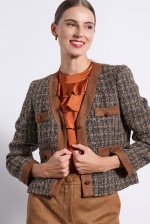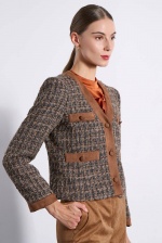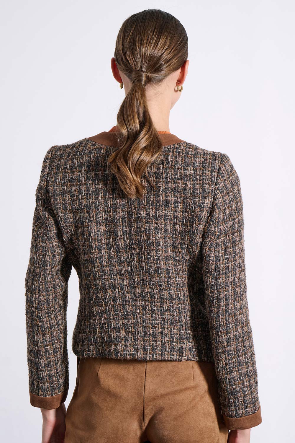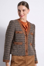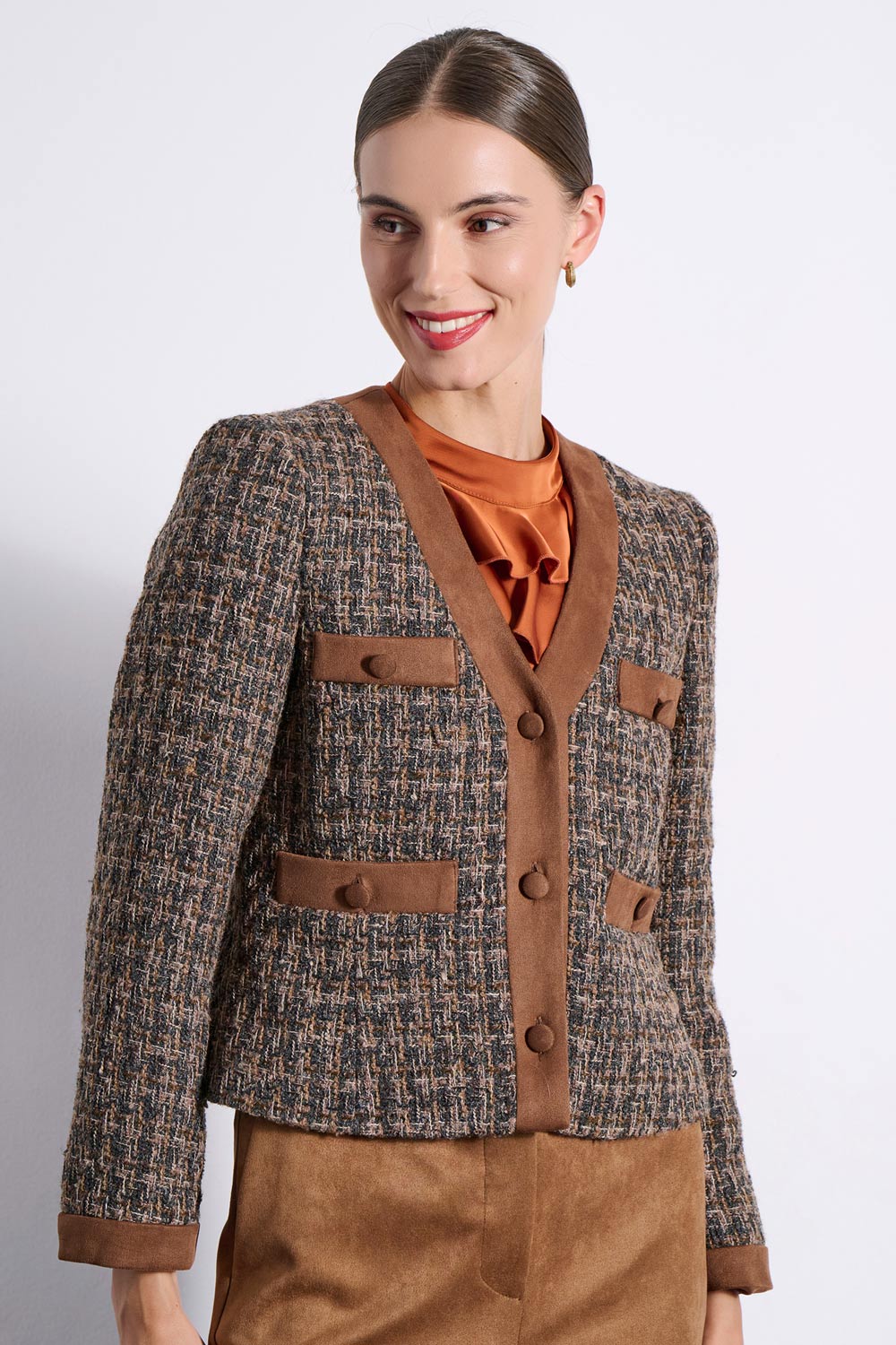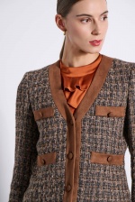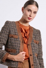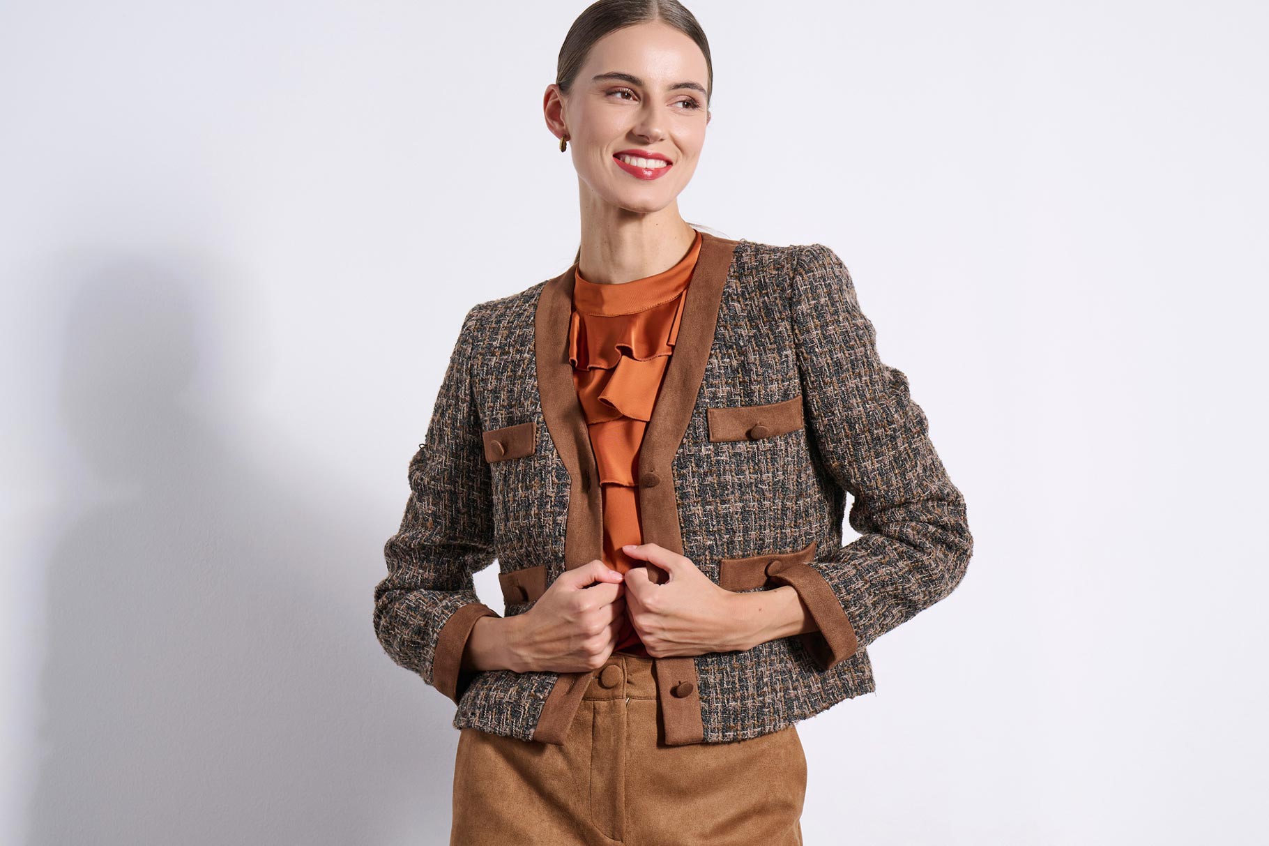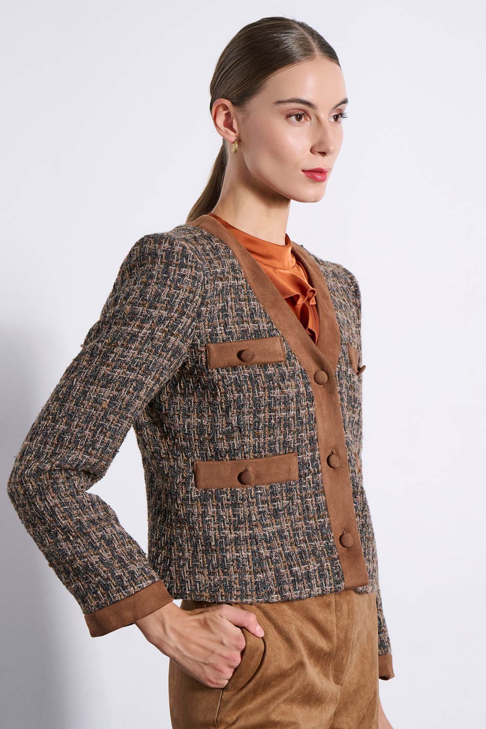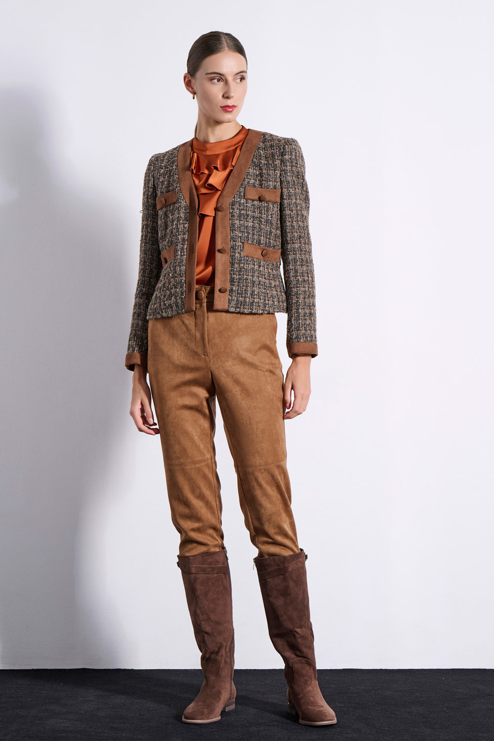 • SUEDE STRIP AT THE NECKLINE AND ALONG THE BUTTONS